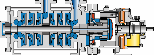 Klaus Union’s SLM-HVO is a sealless multi-stage pump with permanent magnetic coupling for applications with high delivery head requirements. Multiple centrifugal stages are arranged in back-to-back design to reduce axial bearing load to a minimum.